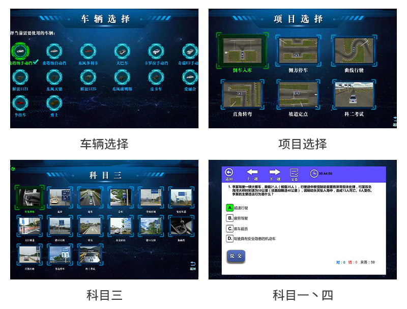 功能:符合2020年9月9日起实施的交通运输行业标准要求,包括基础训练、理论考试(科目一)、场地考试(科目二)、路考(科目三)、安全文明驾驶(科目四)、驾驶技能、自由驾驶、应急训练。